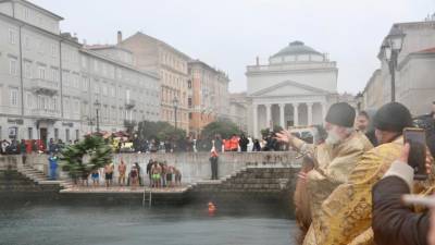 V morje je skočilo sedem pogumnežev (FOTODAMJ@N)( Paolo Giovannini / FOTOGRAFI ) Tržaška Pravoslavni verniki v ledeno morje Sanela Čoralič | 19. jan. 2023 | 19:26