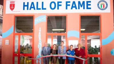Z leve: odbornik Lorenzo Giorgi, kotalkarica Silvia Stibilj, odbornica Francesca De Santis, skakalka v vodo Noemi Bati in odhajajoča predsednica tržaškega odbora združenja Azzurri d’Italia Marcella Skabar (FOTODAMJ@N) Šport Uspešne tržaške športnice na stenah stadiona Rocco Erik Piccini | 20. sep. 2019 | 10:45