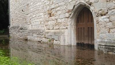 Vhod v štivansko cerkev (FOTODAMJ@N) Tržaška Voda dosegla cerkev v Štivanu Sara Sternad | 5. avg. 2023 | 17:32