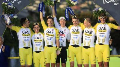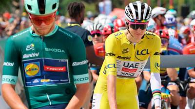 Pogačar (desno) pred današnjim startom (ANSA) Šport Pogačar pred startom današnje etape vpleten v bizarno nesrečo STA | 24. jul. 2025 | 14:40