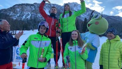 Spodaj mladinska prvaka Gabriele Pauli in Ivana Presl (oba ŠD Mladina), na stopnici zmagovalnega odra absolutna prvaka Christrian Taucer (Devin) in Anja Sosič (Mladina) FOTO ERIK PICCINI Šport Absolutna naslova smučarjema Mladine in Devina Jan Grgič | 16. feb. 2025 | 16:02
