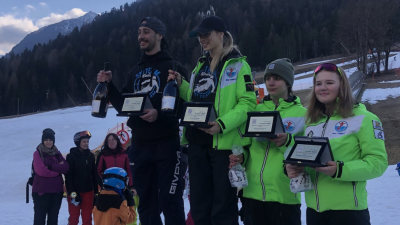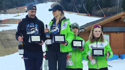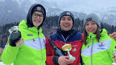Prvaki Maj Sedmak, Nikola Kerpan in Anja Sosič (na fotografiji ni absolutne prvakinje Caterine Sinigoi) Šport Na startu zamejskega prvenstva 180 smučarjev in smučark Veronika Sossa | 17. feb. 2024 | 12:30