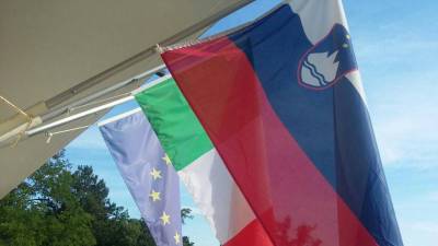 Slovenska, italijanska in evropska zastava na volišču v Nabrežini (VERONIKA JAZBEC)( ) Tržaška Po Gabrovčevi zmagi le zaplapolala slovenska zastava Jaruška Majovski | 13. jun. 2022 | 17:10