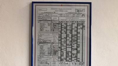 Kopija zapisnika tekme, ki bo odslej krasila dolinsko telovadnico (ERIK FILIPAC)( ) Šport Pred 41 leti košarkarski mojstri očarali Dolino Erik Piccini | 11. jun. 2021 | 23:25