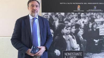 Z leve režiser Luciano Tovoli, Francesco De Filippo in avtor knjige Antonio Caiazza (FOTODAMJ@N) Tržaška Film o zločinih fašizma ostal v arhivih Martin Poljsak | 30. okt. 2025 | 17:15