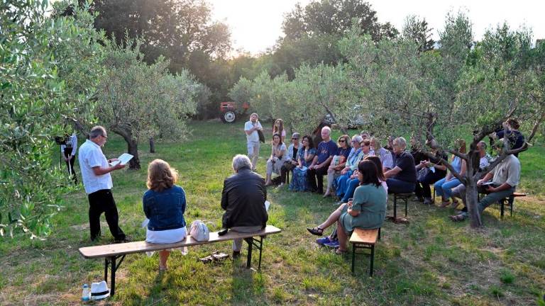 »Njeno Veličanstvo oljka: prvo med drevesi in še marsikaj,« se je začela ljubezenska izpoved, ki jo je v svojem oljčniku na Portovci v Žavljah zrecitiral pesnik in oljkar Boris Pangerc. Tu je v torek potekal poseben večer Besede v mojem oljčniku, ki so ga priredili v sklopu letošnjih Slovenskih dnevov knjige na Tržaškem. Ti se tokrat odvijajo pod geslom Drevo, beseda in človek, zato sta tržaški založbi ZTT in Mladika povabili pesnice in pesnike ter avtorice in avtorje, da pri projektu sodelujejo z recitacijo verzov in odlomkov, posvečenih naravnemu svetu. Literarni večer, ki je potekal v soorganizaciji z dolinskim kulturnim društvom Valentin Vodnik, so priredili v objemu zelenih oljčnih vej.