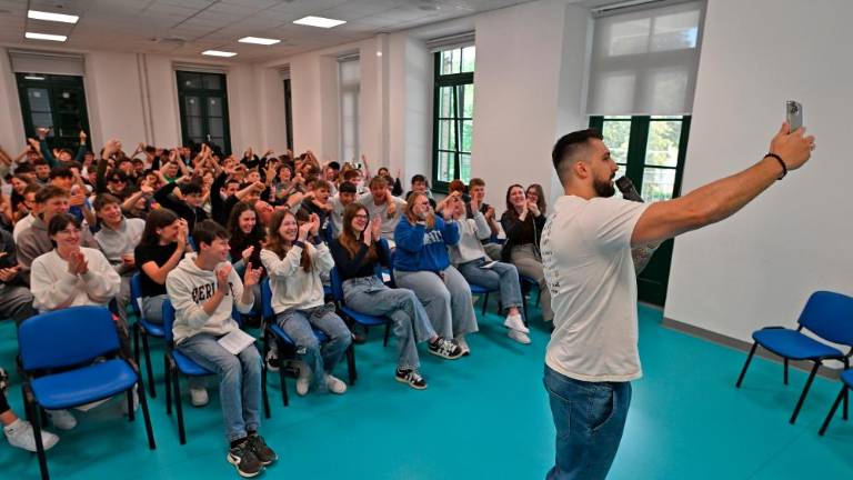 »Sam ona noče z mano, prav da nism zanjo. Ona noče z mano. Pejva na kavo, uzem si ga lagano,« je danes dopoldne odmevalo v veliki dvorani Državnega izobraževalnega zavoda Jožefa Stefana v Svetoivanskem parku. Tam je namreč gostoval Saša Petrović z umetniškim imenom Challe Salle.