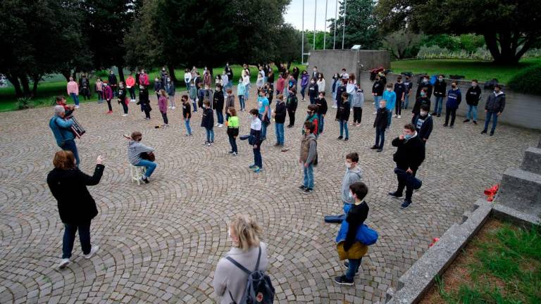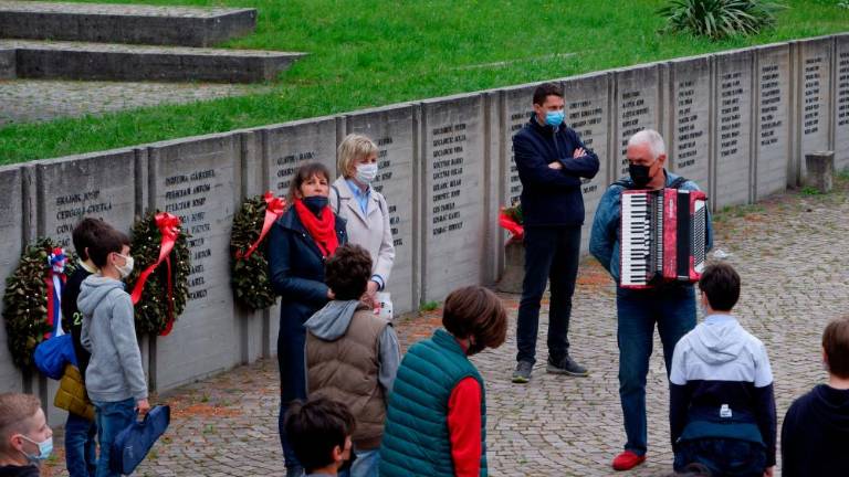 Učenci NSŠ Simon Gregorčič so pod mentorstvom prof. Aleksandre Pertot zapeli in zaigrali borčevsko ljudsko pesem Šivala je deklica zvezdo. Sledil je recital Slovenske pesmi Karla Destovnika Kajuha (pod mentorstvom prof. slovenščine Širec in Ota). Proslavo je sklenil skupen nastop učencev šolskega zbora (zapeli so ponarodelo Bella ciao in pesem Sinku Staneta Maliča in Iga Grudna) ter harmonikarja Mirana Pečenika iz Tržaškega partizanskega pevskega zbora Pinko Tomažič.