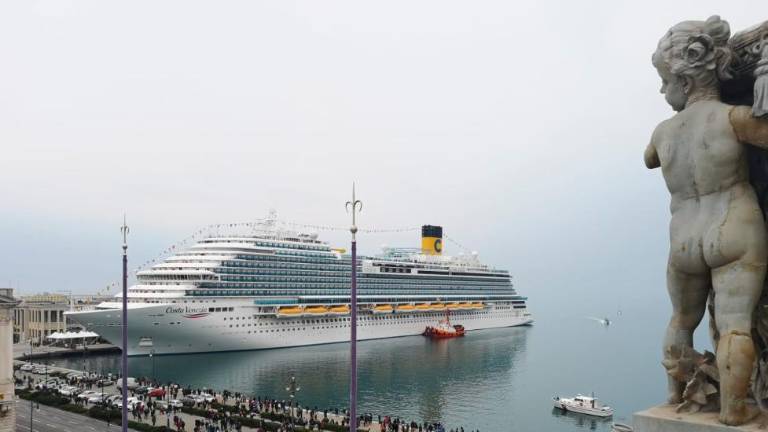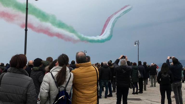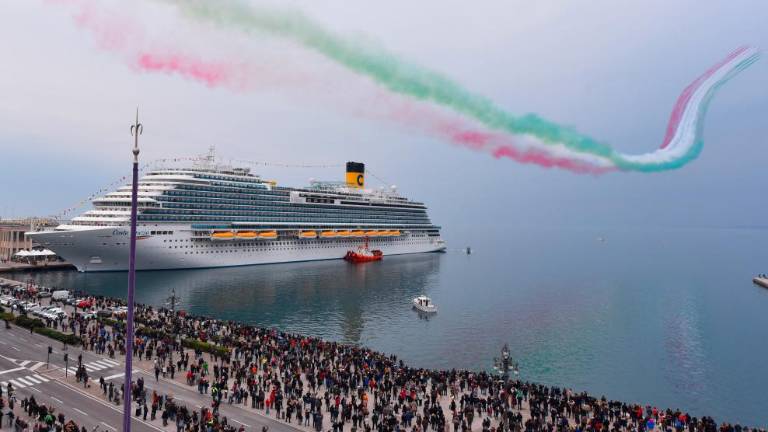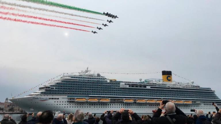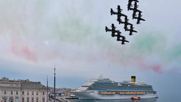 Nad Velikim trgom so popoldne švignila letala akrobatske eskadrilje Frecce Tricolori, ki so v zadnjem obdobju v Trstu že redno gostje. Zadnjič so letala ta trg preletela 4. novembra, ko je potekala slovesnost ob stoletnici konca prve svetovne vojne, tokrat pa so na svoj način pozdravila ladjo Costa Venezia, ki jo je družba Fincantieri zgradila za azijski trg. Krstnega križarjenja, ki se ga po četrtkovi predstavitvi ladje v Tržiču začenja prav v Trstu, se udeležujejo kitajski, korejski, japonski in drugi gostje. Popoldne je na krovu čas za institucionalne trenutke in krst velikanke, sledila bo gala večerja, opolnoči pa bo na vrst še ognjemet.