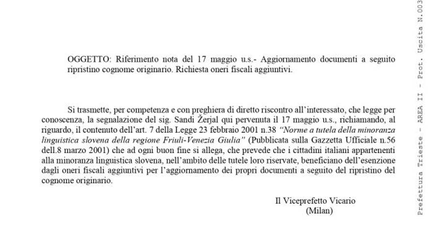 Do nedavnega se je 39-letni Dolinčan Sandi Žerjal pisal Zeriali. Prvotni slovenski družinski priimek je po prefektovem odloku nazaj prejel lani. Če se je sprva zdelo, da z vračanjem slovenskega priimka ne bo večjih težav, pa se je zalomilo, ko bi morali Žerjalu izdati novo prometno dovoljenje z novim/starim slovenskim priimkom. Uradniki v Ulici Udine so padli z oblakov in niso vedeli, kaj naj storijo, Žerjal pa je moral pomoč iskati sam.