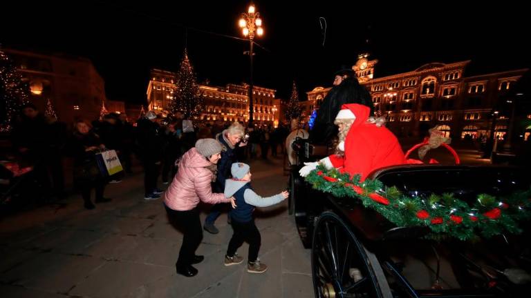 Dvovprega lipicancev iz Kobilarne Lipica in Božiček iz Radovljice sta sinoči na praznično okrašenem Velikem trgu pozdravila naključne sprehajalce. Gostom iz Slovenije je v neposredni bližini deželne palače s slovenskim pozdravom dober večer dobrodošlico izrekel tržaški župan Roberto Dipiazza, ki se je nato povzpel na kočijo in se v družbi Božička zapeljal do fontane pred Mestno hišo.