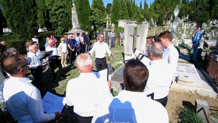 Točno 91 let kasneje je ob 10. uri izpred glavnega vhoda na pokopališče krenil sprevod do groba štirih junakov, v katerega so jih krvniki po usmrtitvi na skrivaj zakopali. »Že 76 let se vsako leto na dan ustrelitve naših junakov zberemo na tem kraju. Od leta 1969 grob štirih krasi lep spomenik, prej so tu stali štirje kamni v obliki romba,« je uvodoma razložil Milan Pahor, predsednik Odbora za proslavo bazoviških junakov in predlagal enominutni molk. Ob spremljavi moškega pevskega zbora Fantje izpod Grmade, ki je pod vodstvom Bogdana Kralja ubrano zapel žalostinko Žrtvam, so se junakom s polaganjem vencev poklonili predstavniki kulturnih, političnih in borčevskih organizacij. Za častno stražo so poskrbeli taborniki Rodu modrega vala in skavti Slovenske zamejske skavtske organizacije.