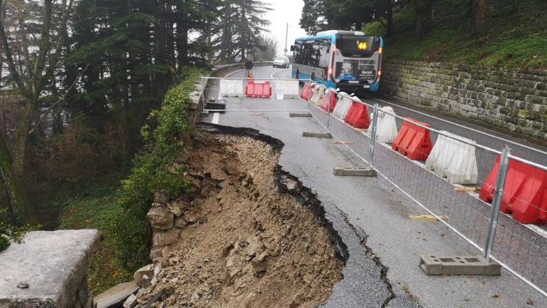 Pred enim letom so se na cestišču pokazale prve razpoke, pred tednom dni je v spodnji breg zgrmel obcestni zid, sedaj pa je v globino zgrmel del cestišča. Na kontovelskem Frnedu skratka ni videti konca težavam. Zatem, ko je popustil obcestni zid, so zavarovali območje in odvzeli nekaj geoloških vzorcev, včeraj pa so si cestni odsek ogledali gasilci.