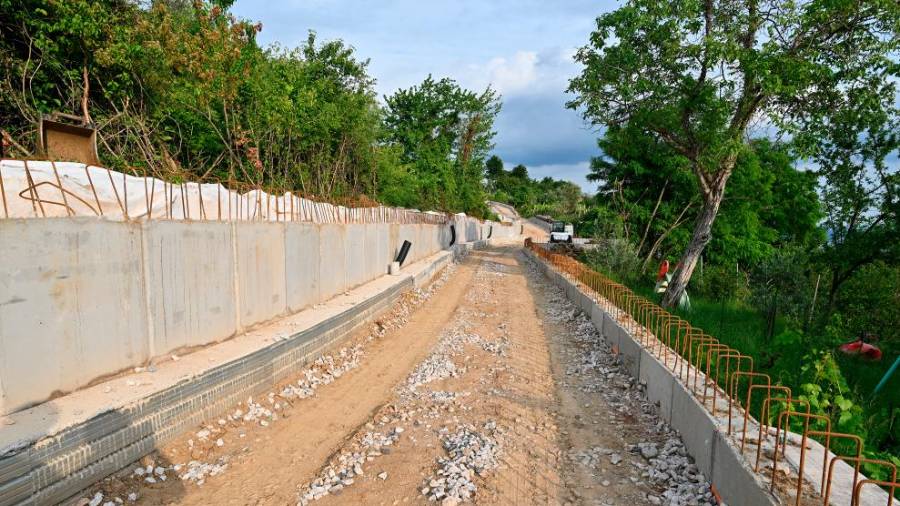 Na odseku, ki ga ureja Konzorcij, dela mirujejo, saj čakajo na horizontalne armiranobetonske vezi, da bi zaključili oporne zidove ob cesti. Na zadnjo stran gornjih zidov so namestili drenažno vrečo iz geotekstila, ki bo služila odvajanju vode s hriba oz. njenemu preusmerjanju skozi cevi ob vznožju stene. Voda bo pronicala skozi vrečo, v kateri je kamenje. Ko bo stena nared, bodo vrečo zaprli in nad njo nasuli zemljo na raven parcele, zunanjo stranico zidu pa obložili s kamni. Krajani so inženirja prosili, naj nekaj centimetrov kamenja odstranijo iz vreče, da bo nasute zemlje nad njim več in se bo dalo kaj posaditi.
