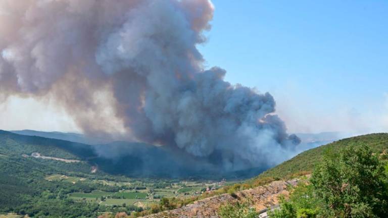 Požariščno območje se je ob 15. uri še občutno povečalo, k čemur je pripomogla okrepljena burja. Ogenj se je nevarno približal hišam v Ospu. Iznad območja se dviguje ogromen temen oblak, ki se je v zadnjih minutah še občutno povečal. Ognjena stihija se ob burji širi proti jugozahodu.