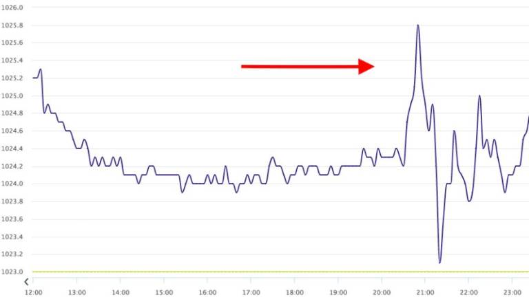 Nenadno spremembo z nenavadno hitrim dvigom in padcem zračnega tlaka smo zabeležili tudi v Boljuncu (na fotografiji). V soboto, 15. januarja, je ob 20.30 zračni tlak pri nas znašal 1024,2 hPa, ob 20.50, torej le dvajset minut kasneje 1025,8 hPa, ob 21,20 pa je padel na 1023,1 hPa, kar je lepo razvidno iz priloženega grafa.