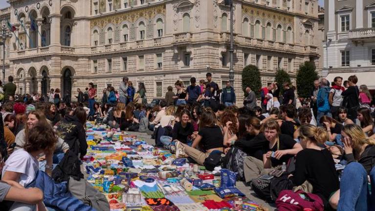 Korak je zastal vsem tistim, ki so se včeraj ob 13. uri mudili na Velikem trgu. Pogled »na ogromno pogrnjeno mizo s številnimi povabljenci« je bil čudovit. Pa ni bilo dejansko nobene mize, le 90-metrski pisani prt (širok je 1,80 metra), ki so ga raztegnili po tleh na trgu, in ob katerem je sedelo 1870 dijakov 26 tržaških prvo- in drugostopenjskih srednjih šol, tudi slovenskih, ter njihovih profesorjev. Vsak je prispeval košček blaga in ga prišil drugim, tako da je na koncu nastal velik in raznolik prt, kot izraz tkanja odnosov, sodelovanja in bratstva.