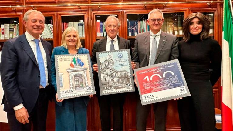 Ministrstvo za podjetništvo je izdalo znamko, posvečeno stoletnici Univerze v Trstu, in jo uvrstilo v niz o »odličnostih znanja«. Znamka velja 1,25 evra, prikazuje pa sedež univerze s številom 100 v ozadju. Znamki so posvetili tudi neapeljski univerzi Federico II in Univerzi v Firencah, ki praznujeta 800 oziroma 100 let. Predstavitve so se udeležili trije rektorji ter ministra Adolfo Urso in Anna Maria Bernini. »Simbol v našem logotipu oznanja novo zoro znanja in se klanja delu ter kulturni sintezi, opravljenima na zapletenem območju,« je izjavil rektor Roberto Di Lenarda ter omenil podelitev častne diplome predsedniku Sergiu Mattarelli in bivšemu slovenskemu predsedniku Borutu Pahorju.