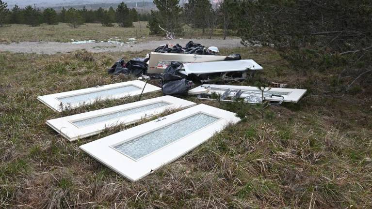 Minil je le mesec dni, odkar smo se zadnjič potikali po Banih in v spremstvu vaščank in vaščanov beležili kupe nedovoljeno odvrženega gradbenega materiala sredi gmajne oz. gozda, včeraj pa smo znova pešačili nad zapuščeno vaško vojašnico Monte Cimone. Pred kakimi petimi dnevi so dočakali novo »pošiljko« odpadkov. Nedaleč stran od kupov, ki že več mesecev, celo let še vedno nespremenjeni ležijo sredi zelenja, se je pojavilo več črnih vreč z ometom, ploščicami in lesenimi ostanki, ob njih pa tudi večja kad, razbite sanitarije, lestev in pet vrat s stekleno šipo, ki se čudežno ni razbila med prevozom oziroma odlaganjem.