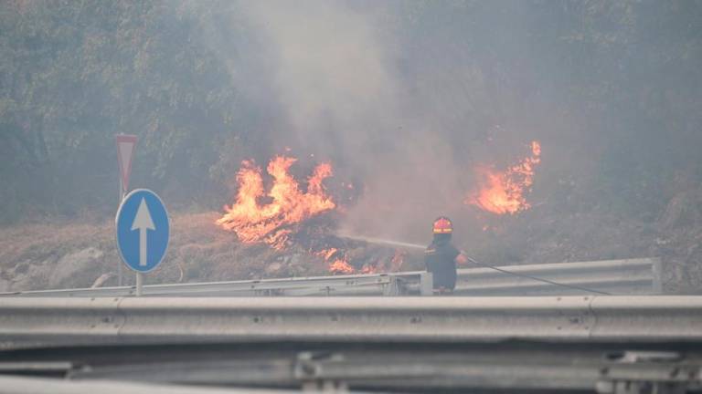 Ogenj, ki se je vnel na območju za avtocestnim počivališčem pri Devinu se naglo širi, k čemur so pripomogli tudi veter in zelo visoke temperature. Požar je že prečkal avtocesto in je zagorelo tudi na njeni južni strani, nato je ognjena stihija prečkala še državno cesto pri Sesljanu in se približuje območju Rilkejeve poti.