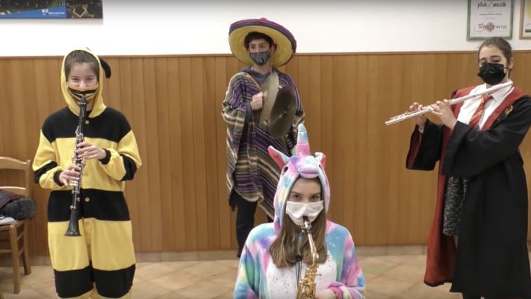 Pust in godba sta neločljiv binom. Vsako leto lahko na povorki na pustno soboto ob ogledovanju vozov in skupin prisluhnemo tudi godbeniškim sestavom, ki med ljudmi širijo veselje in razposajeno pustno razpoloženje. Tudi letos so se godbe s Tržaškega, kljub koronavirusnim omejitvam, zaradi katerih ni bilo mogoče prirediti povork in koledovanj, odločile, da javnost razveselijo s tradicionalnim godbenim nastopom. Tako sta Godbeno društvo Nabrežina ter Godbeno društvo Prosek na svojih družbenih omrežjih objavila videoposnetek godbenikov, ki igrajo v maškarah.