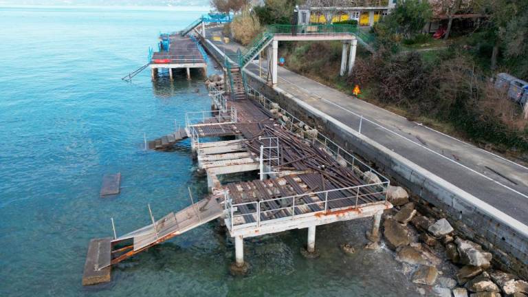 Jugozahodnik tokrat ni prizanesel niti miljski obali in udaril po njeni najšibkejši in najbolj izpostavljeni točki. Kot smo poročali v preteklih dneh, je cesta za Lazaret delno uničena. Pred Malim rtičem, kjer sta postavljena začasna zapora in prepoved prehoda za vozila in pešce, visi lesena cestna ograja, ki se na rjavih količkih komaj drži.