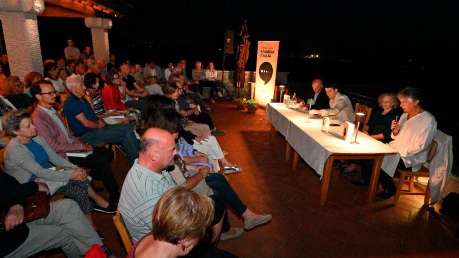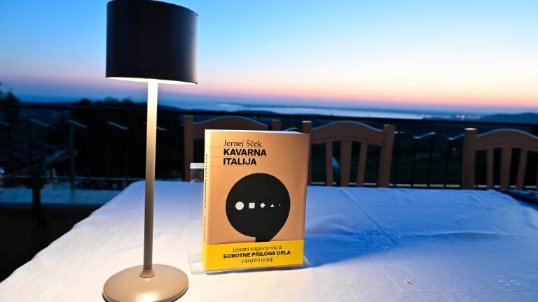 »Dobra knjiga lepo mesto najde.« Tako je profesor Miran Košuta za četrtkovo predstavitev knjige Kavarna Italija Jerneja Ščeka priredil slovenski pregovor »lepa beseda lepo mesto najde«. Prva zamejska predstavitev zbirke 26 intervjujev, 22 z moškimi, štiri z ženskami, ki so sicer nastali za Delovo Sobotno prilogo med letoma 2020 in 2023, se je odvijala pred resda očarljivo kuliso sončnega zatona nad Tržaškim zalivom, na terasi kmetije Zidarich v Praprotu.