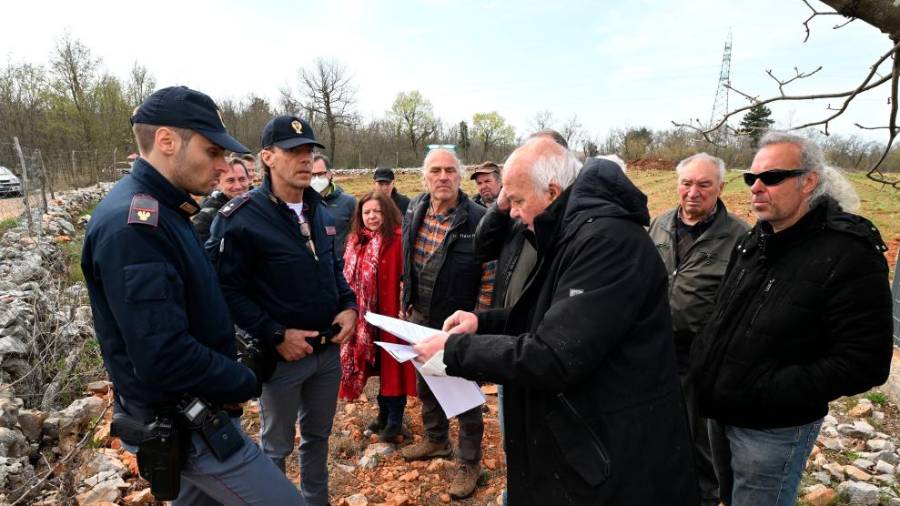 »Priporočilno pismo sem vrnil, ker ni bilo na kuverti niti besede v slovenščini. Njegove vsebine ne poznam oz. nisem z njo ustrezno informiran, tako da ne bom pristal na nobeno dogovarjanje.« Tako sta Jakob Zidarich in Edi Kante ponovila deželnima geometroma, ki sta danes predstavljala razlastitveni organ. Da bodo kljub temu ukrepali, jima je potrdila deželna zastopnica Leonora Furlan, zato sta se sama z jusarji postavila pred vhod v zemljišče in potrdila, da bi bil nedovoljeni vstop kaznivo dejanje. Deželnim predstavnikom ni ostalo drugega kot poskrbeti za zapisnik in se umakniti.