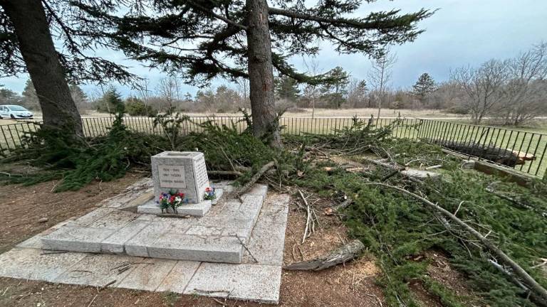 Veter je podrl mogočno libanonsko cedro desno od spomenika, posvečenega Ferdu Bidovcu, Franu Marušiču, Alojzu Valenčiču in Zvonimirju Milošu. Hlod je zgrmel na kamnito spominsko obeležje, ga prevrnil in razklal na dva kosa. »Po prvih informacijah tehnikov, ki so si ogledali polomljeno obeležje, bo mogoče kamna združiti in spomenik popraviti,« je danes po seji odbora za Primorski dnevnik povedal Milan Pahor. »Zaenkrat so nam strokovnjaki podali le ustno mnenje. Vsekakor pa bi radi, da se spomeniku vrne originalna podoba,« je še dejal Pahor.
