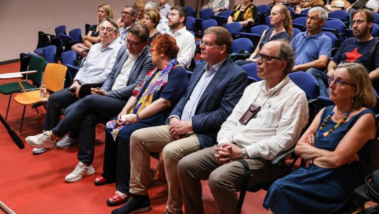 Po polaganju se je dogajanje preselilo v veliko dvorano, kjer so prisotne nagovorili Ksenija Majovski (predsednica Društva Slovensko gledališče) v imenu organizatorjev ter deželni svetnik Marko Pisani in senatorka Tatjana Rojc kot glavna politična predstavnika naše skupnosti. Majovski je spomnila na tradicijo slovenskega gledališča v Trstu, saj je bilo gledališče, ki je domovalo v Narodnem domu, prvo tržaško poklicno gledališče. Izpostavila je vizijo naših prednikov, ki so si ob gospodarskem razvoju želeli tudi kulturnega. Rojc je Narodni dom opisala kot »emblem našega gospodarskega in kulturnega vzpona«, v njem, v Narodnem domu pri Sv. Ivanu in v Kosovelovem kipu v Ljudskem vrtu pa vidi našo vztrajnost in trmo. Vrnitev doma Slovencem in takratni stisk rok predsednikov republik pa naj bodo temelji za prihodnost. Pisani vidi v Narodnem domu, kakršnem je bil, daljnovidnost in ambicijo Slovencev. »Idiličnega vrveža se ne da dobiti nazaj,» je dejal. Najti je treba zato nove načine, kako oživeti ponovno naš Narodni dom.