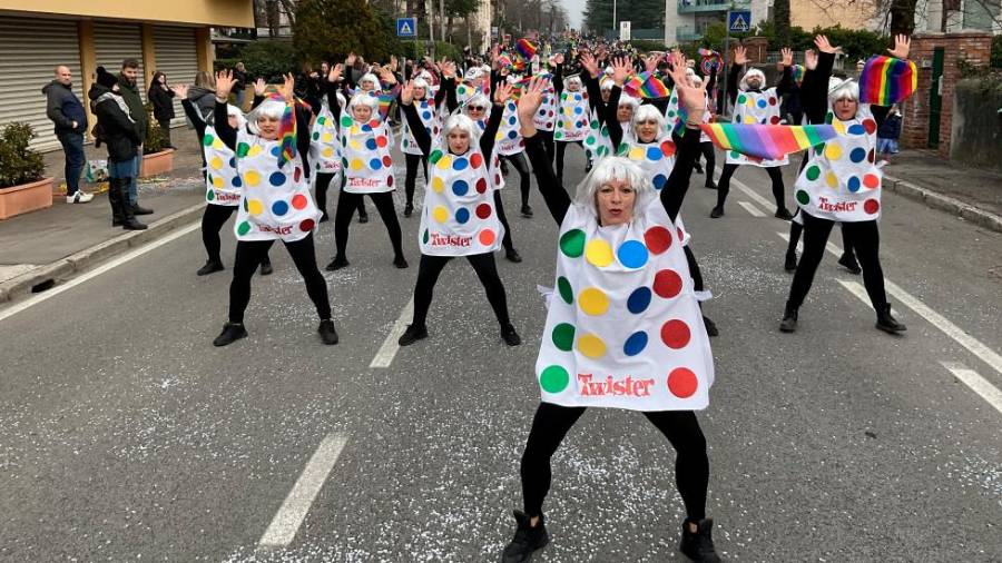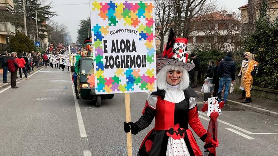 Sledi skupina Gruppo Trieste, ki prav tako nastopa izven konkurence, z naslovom E alora zoghemo - Igrajmo se, povratek v mladost. In prav zato se igrajo, obleki so se v twister, šahovske figure, karte ...