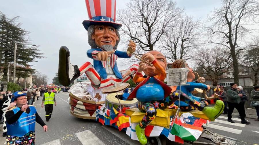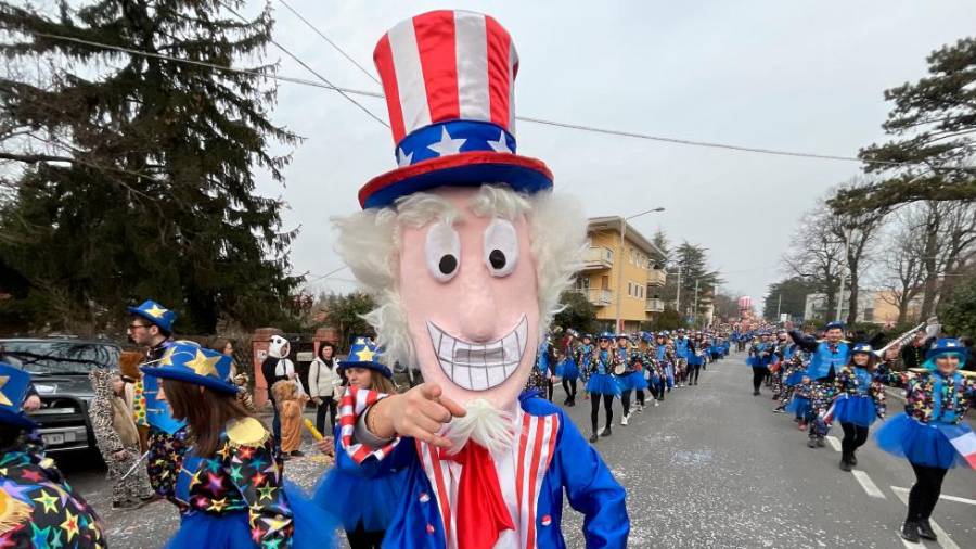 Pod vozom pleše več kot 180 mask, ki predstavljajo evropske države, vodi pa jih stric Sam iz Amerike.