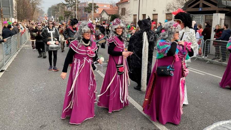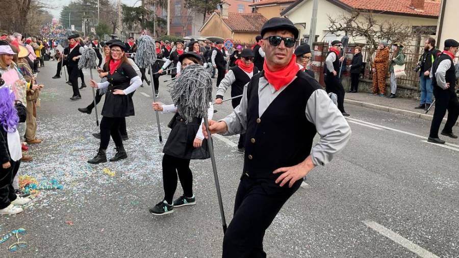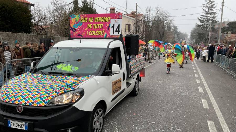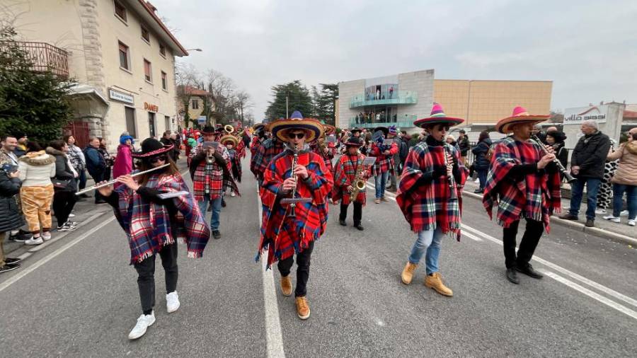 Prispel je prvi voz na letošnjem Kraškem pustu, in sicer Godba padajočih zvezd iz Šempolaja.