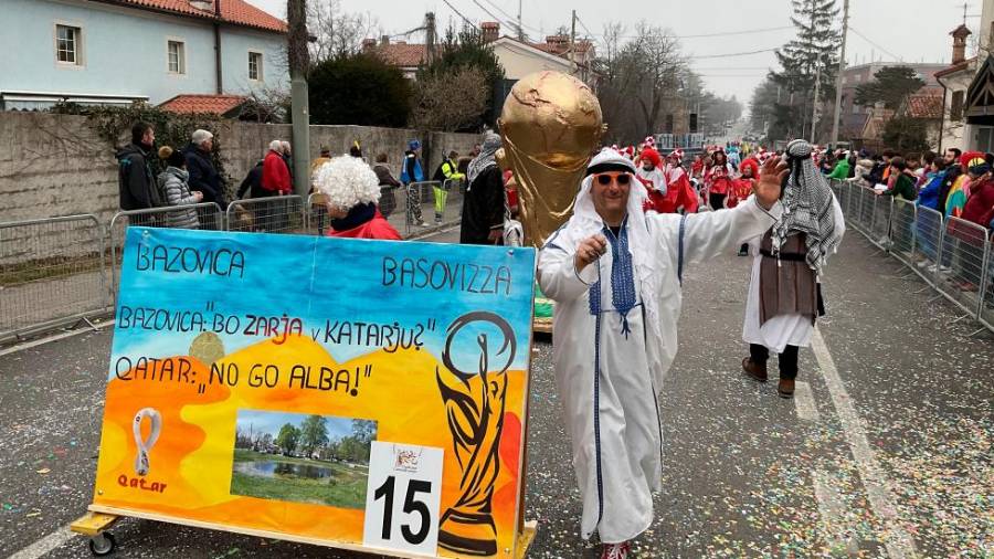 Letošnji sprevod zaključujejo pustarji iz Bazovice. Sprašujejo se, ali bo Zarja v Katarju in se seveda nanašajo na nogometno svetovno prvenstvo. Med nogometaši je opaziti tudi Katarce, navijačice različnih ekip pa tudi argentinske navijače. Predvsem so oblečene v rdeče-bele barve Zarje in navijajo za domačo ekipo, ki igra finale svetovnega prvenstva proti Argentini.