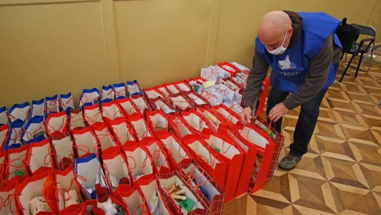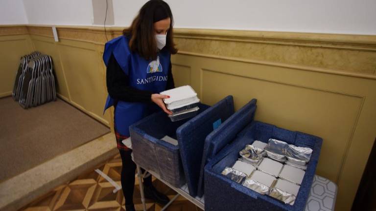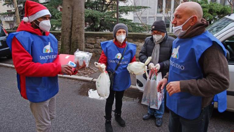 Tradicionalnega kosila za begunce, brezdomce, socialno šibkejše in starejše tokrat žal ni bilo mogoče organizirati, saj tovrstna druženja niso dovoljena. Namesto praznične pojedine so člani skupnosti ljudem razdelili vnaprej pripravljene prehranske pakete in darove. Med 6. decembrom im božičnim dnem so na domu obiskali 418 oseb v stiski, pakete pa jim je dostavilo 89 humanitarcev, med kateri je bilo letos 21 novih. Dobrodelna akcija se je zaključila na božični dan, ko so s sedeža skupnosti v Ul. Romagna odpeljali še zadnje pakete. Zraven smo bili tudi mi.