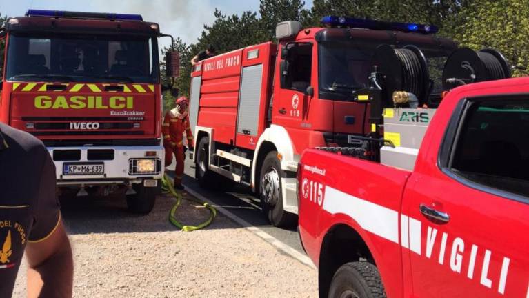 Pri gašenju požara, ki se je dopoldne razplamtel med Kastelcem in Petrinjami in je po grobih ocenah zajel več kot 30 hektarjev borovega gozda, so več kot 150 poklicnim in prostovoljnim gasilcem kraške in obalne gasilske zveze priskočili na pomoč tudi gasilci s tržaškega pokrajinskega poveljstva.