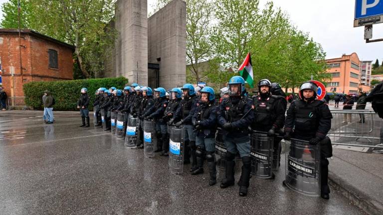 Ob vhodu policisti pregledujejo ljudi. Med številnimi udeleženci je tudi znani italijanski pevec Piero Pelù.
