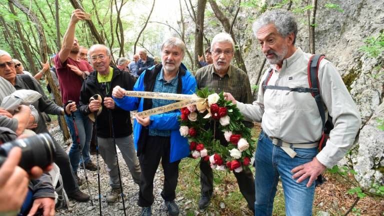 Na steno Počivenca v dolini Glinščice so 24. aprila popoldne, na predvečer današnjega (25. aprila) praznika osvoboditve, prvič namestili venec v spomin na 18 tržaških slovenskih in italijanskih gornikov - osem t.i. »Brutov«, šest Slovencev in štiri žrtve fašističnih rasnih zakonov - ki so se odločili za boj proti fašizmu in nacizmu ter to plačali z življenjem (na sliki FOTODAMJ@N). Skupina, ki se je podala do Počivence, se je odzvala na vabilo Dušana Jelinčiča, Livia Isaaka Sirovicha in Paola Rumiza, predstavnikov Slovenskega planinskega društva Trst ter društev CAI XXX Ottobre in Società Alpina delle Giulie, ki so s tem hoteli počastiti spomin na krivično pozabljeno osemnajsterico.