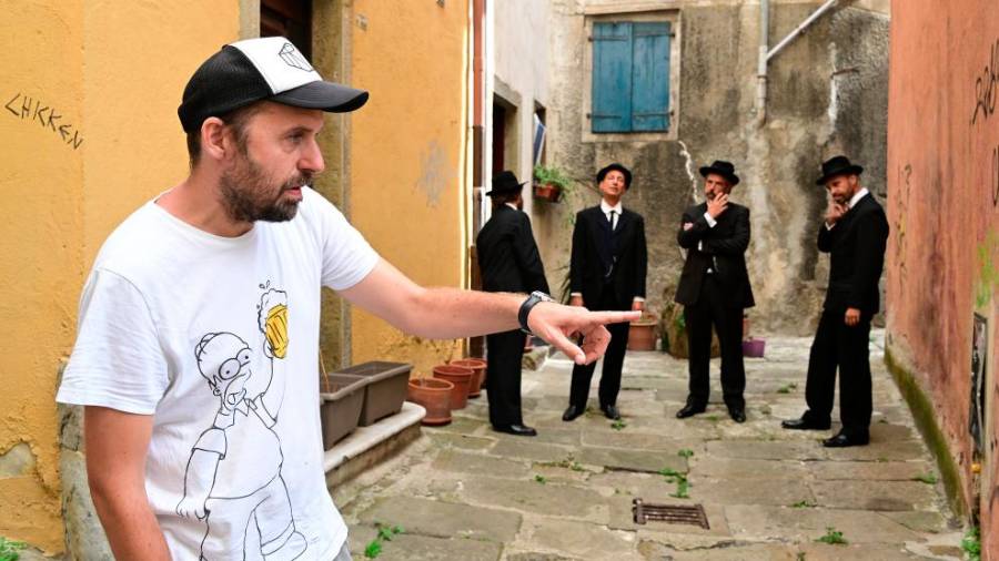 »David, pridi dol!« so včeraj v Ulici Colombi pri Rihardovem slavoloku klicali trije gospodje v elegantnih oblekah iz prvih let 20. stoletja. Kmalu jih je dosegel še četrti, tisti, ki so ga iskali. Gentlemani v črnih kompletih so bili tržaški igralci Danijel Malalan, Adriano Giraldi, Francesco Godina in Andrea Germani, usmerjal jih je tržaški režiser Martin Turk, ki tu snema nov dokumentarec z naslovom Kino Volta.