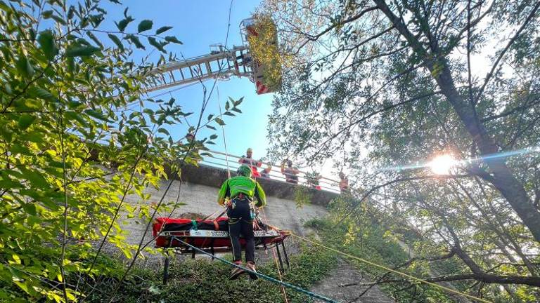 Gorski reševalci iz Trsta, gasilci, karabinjerji, lokalni policisti in reševalci službe 118 so danes ob 9. uri posredovali ob stezi, ki pelje na plažo Pri čupah pod Nabrežino, kjer se je poškodovala 46-letna ženska. Z Obalne ceste je padla v globino osmih metrov. Mimoidoči, ki so slišali njene klice na pomoč, so poklicali na interventno telefonsko številko za klice v sili 112. Gorski reševalci so se z Obalne ceste z vrvmi spustili do ponesrečenke. Na kraju so jo stabilizirali in jo naložili na nosila. Z avtolestvijo tržaških gasilcev so jo dvignili na cesto, nato so jo izročili reševalcem službe 118. Zdravstveno osebje je ugotovilo, da si je domnevno zlomila gleženj in da se je udarila v prsni koš.