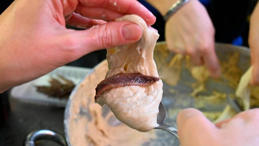 Kot vsako kvašeno testo morajo tudi fanclji počivati v toplem prostoru. Približno pol ure kasneje je masa pripravljena za cvrtje: zajemanje ravno prave količine testa in spretno vpletanje »slanega sarduna« vanj je namreč prava umetnost. Ne le gnesti, fanclje je treba tudi cvreti z občutkom, jih v pravem trenutku obračati ter po njih rahlo tolči. Votel zvok je namreč znak, da so ravno prav ocvrti. Mlačni, rahli in hrustljavi fancli z düšo se še najbolje podajo h kozarcu novega belega vina. Pa dober tek!